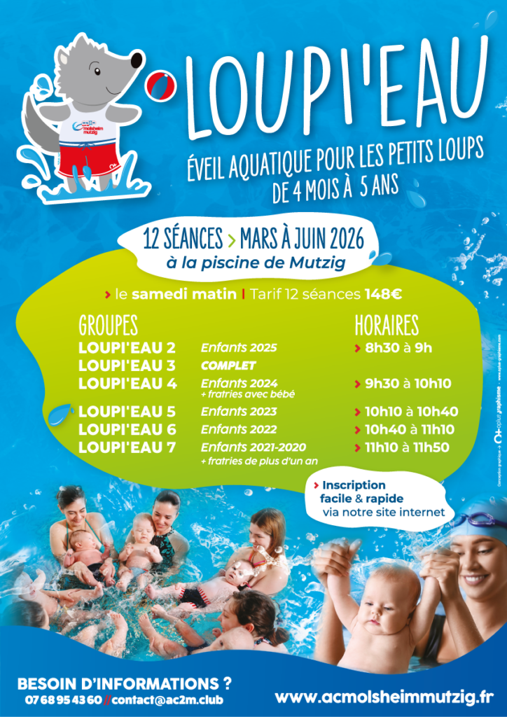 Pas encore prêt ? Pas de souci ! Les enfants nés en 2021 et 2020 peuvent participer aux séances d’éveil aquatique en famille, avec les Loupi’eau de l’AC2M, le samedi matin à la piscine de Mutzig, accompagnés d’un adulte minimum ou de 2 adultes maximum (sans test).